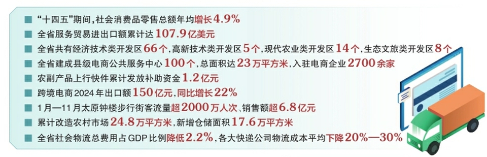 數(shù)字顯示,“十四五”期間,社會消費品零售總額年均增長4.9%,建成100個鄉(xiāng)村e鎮(zhèn),打造了大同黃花等113個區(qū)域公用品牌。農(nóng)產(chǎn)品上行快件補助帶動約33億元農(nóng)產(chǎn)品銷售。實物商品網(wǎng)上零售額年均增長24.1%,高于全國17.1個百分點。