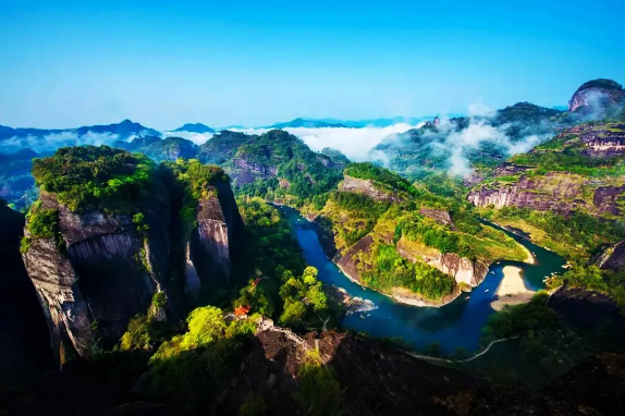 武夷山是三教名山,素有“奇秀甲東南”之美譽,最高峰黃崗山海拔2158米,為東南第一峰,號稱“華東屋脊”。倘登高俯視,云興霞蔚,那九曲溪流、三十六峰、七十二洞、九十九巖的山水奇境,令人目不暇接,嘖嘖稱奇。五臺山是世界佛教名山,享有“清涼圣境”之美譽,最高峰葉斗峰海拔3061米,為華北第一峰,號稱“華北屋脊”。若置身臺巔,東臺能看云海日出,西臺能賞清風明月,南臺能觀爛漫山花,北臺能望無垢瑞雪,中臺可攬星辰萬象,一時恍若仙境,不由得馳思遐想。