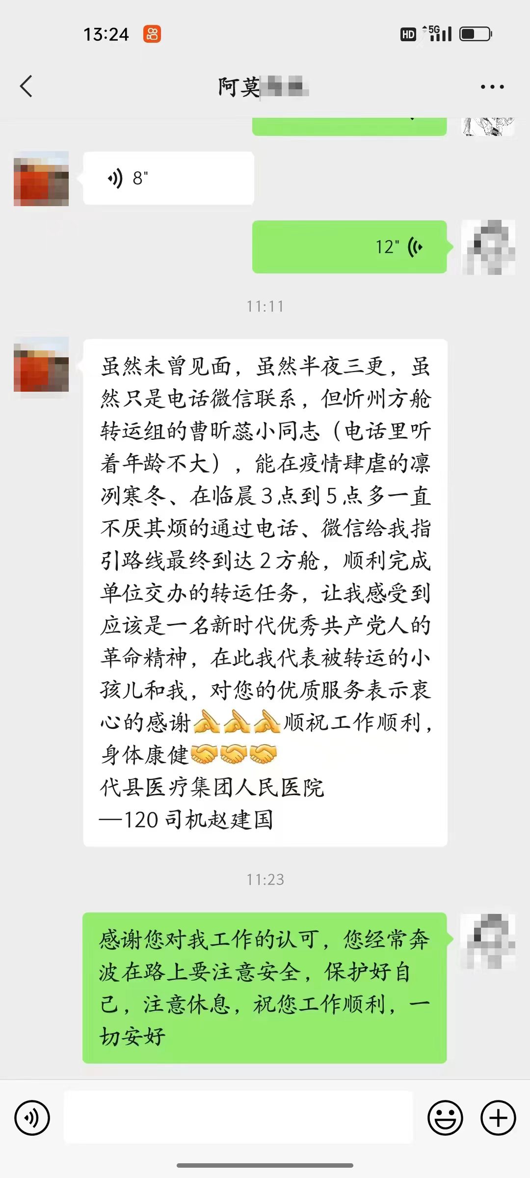 “雖然未曾見面,但在疫情肆虐的凜冽寒冬,在凌晨3點至5點,一直不厭其煩的通過電話、微信給我指引路線,最終到達2方艙。讓我感受到一名新時代年輕人的精神品質,在此我代表被轉運的小孩,對您的優(yōu)質服務表示衷心的感謝?!表樌瓿赊D運任務的代縣醫(yī)療集團人民醫(yī)院120司機趙建國,在微信上對素未謀面的忻州方艙轉運組曹昕蕊表達了自己的感謝。