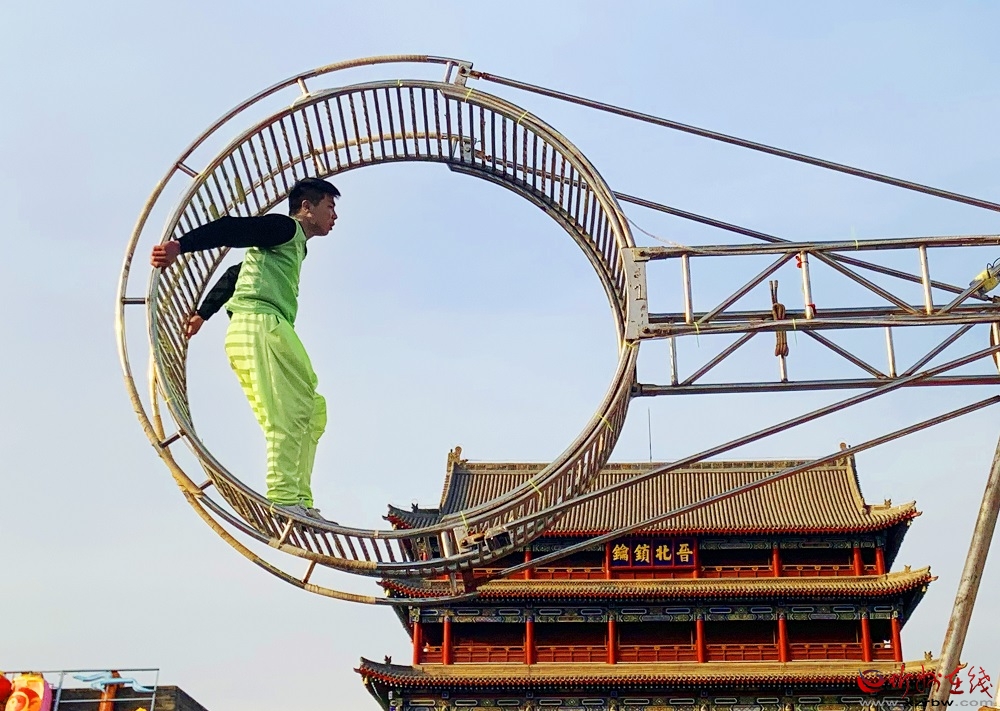 大飛輪等高度的特技表演有著廣闊的舞臺(tái)空間,給演員創(chuàng)造出更廣闊的空間來表現(xiàn)張力。這在其他類型的特技表演節(jié)目中沒有,在實(shí)際表演中演員更融合了奇、巧、難、危等因素,以此來表現(xiàn)中高空表演的張力,突顯節(jié)目的魅力。幾位演員從容應(yīng)對不出一點(diǎn)失誤,在給觀眾帶來驚奇體驗(yàn)的同時(shí),也看得出他們在平常的訓(xùn)練中多么的細(xì)致入微,讓來忻州古城游覽的人們感受到豐富多彩的文化生活。(范琛)