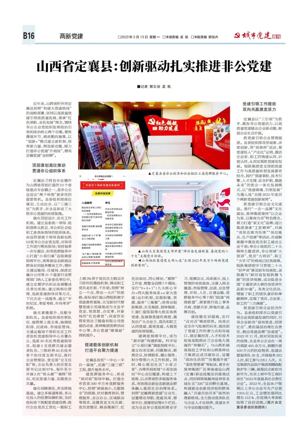 近年來(lái),山西省忻州市定襄縣按照“構(gòu)建大黨建格局”的戰(zhàn)略部署,堅(jiān)持以高質(zhì)量黨建引領(lǐng)高質(zhì)量發(fā)展,秉承“紅色領(lǐng)航、金色發(fā)展”理念,圍繞非公企業(yè)黨組織發(fā)揮政治引領(lǐng)和政治核心兩個(gè)功能,聚焦薄弱環(huán)節(jié),精準(zhǔn)靶向施策,以“創(chuàng)新+”模式建立新機(jī)制、培育新力量、釋放新動(dòng)能,傾力打造非公黨建“升級(jí)版”,擦亮定襄黨建“金招牌”。
