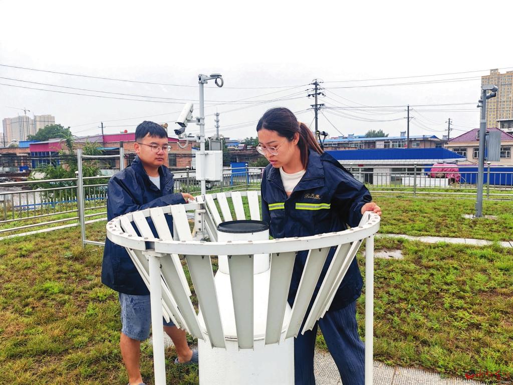 7月30日,氣象業(yè)務(wù)人員冒雨檢查降水監(jiān)測(cè)儀器。