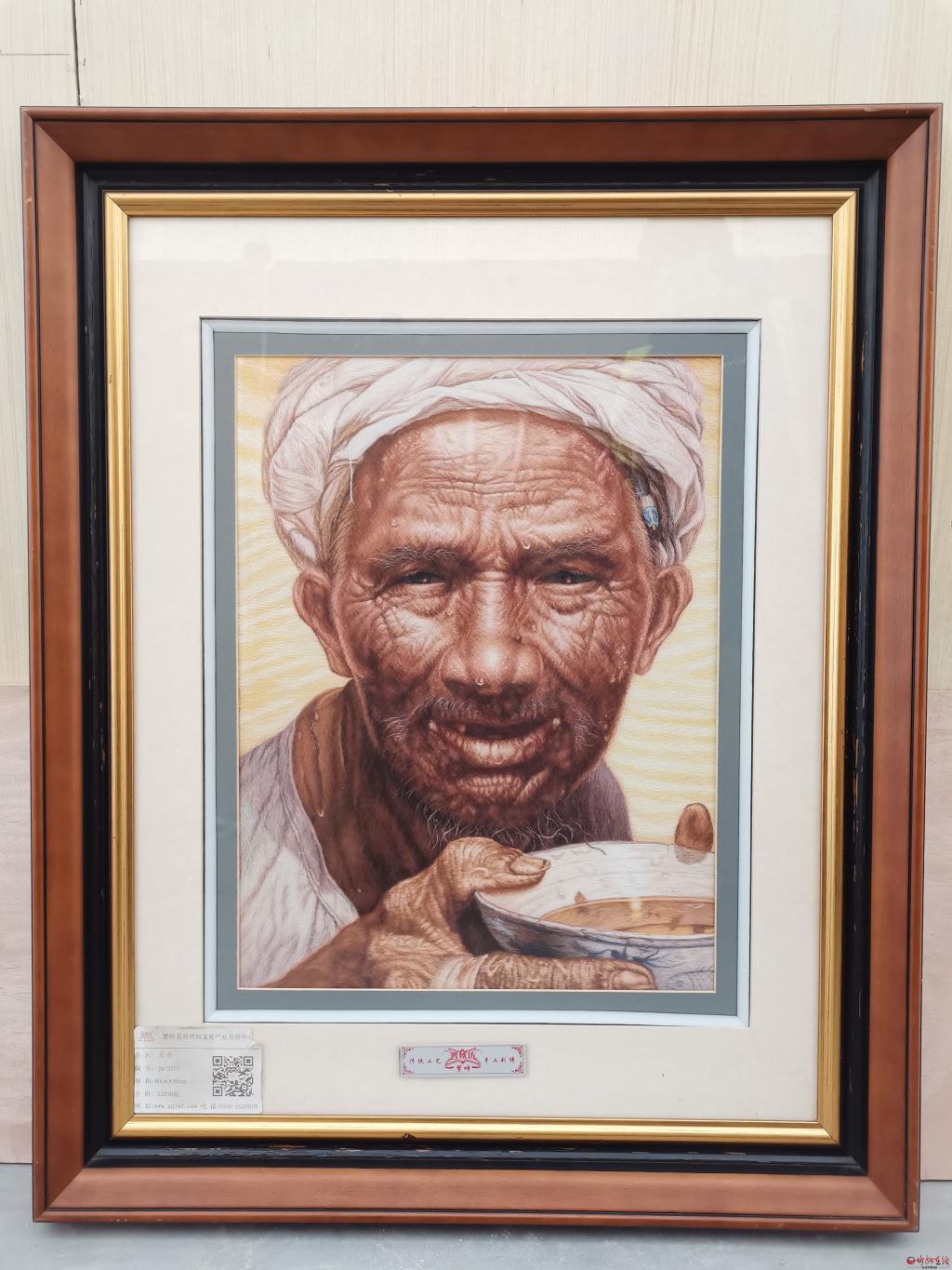 晉繡展品《父親》。以著名油畫為底圖,由晉繡坊非遺傳承人、資深繁峙繡娘歷時(shí)八個(gè)多月繡制完成。宮清華 攝