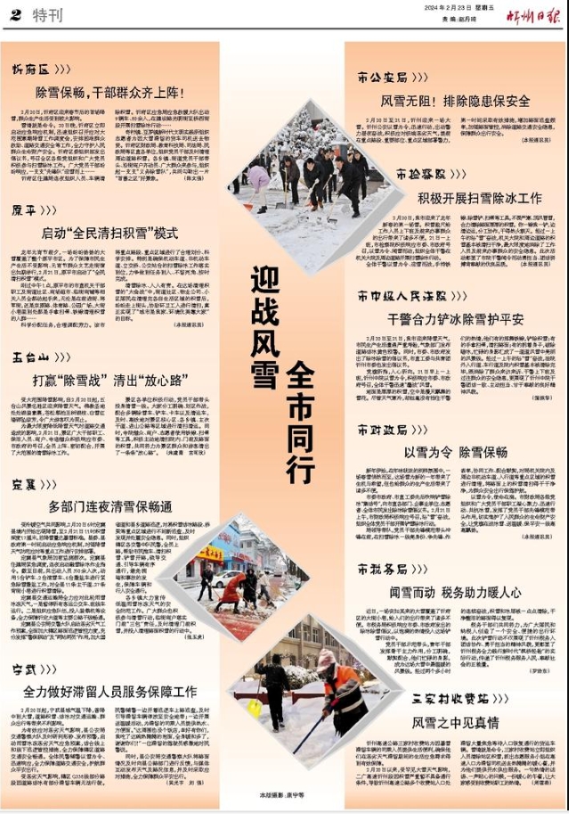 雪情就是命令。20日晚,忻府區(qū)立即啟動應(yīng)急響應(yīng)機(jī)制,迅速組織召開應(yīng)對大范圍寒潮降雪工作調(diào)度會,安排困難群眾救助、道路交通安全等工作,全力守護(hù)人民群眾生命財產(chǎn)安全。忻府區(qū)委組織部發(fā)出倡議書,號召全區(qū)各級黨組織和廣大黨員積極參與掃雪除冰工作。廣大黨員干部紛紛響應(yīng),一支支“先鋒隊(duì)”迎雪而上……