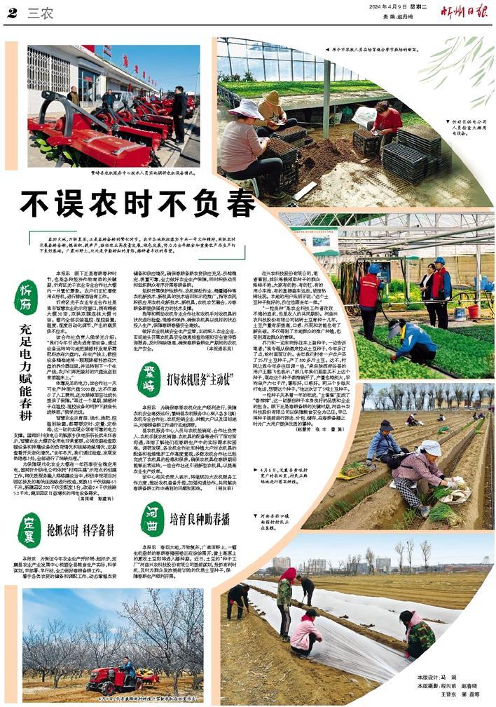 春回大地,萬物復(fù)蘇,正是春耕備耕的繁忙時(shí)節(jié)。我市各地積極落實(shí)中央一號文件精神,搶抓農(nóng)時(shí)開展春耕備耕,穩(wěn)面積、提單產(chǎn),推動(dòng)農(nóng)業(yè)高質(zhì)量發(fā)展、綠色發(fā)展,努力為全年糧食和重要農(nóng)產(chǎn)品生產(chǎn)打下良好基礎(chǔ)。廣袤田野上,處處是辛勤耕耘的身影,播種著豐收的希望。