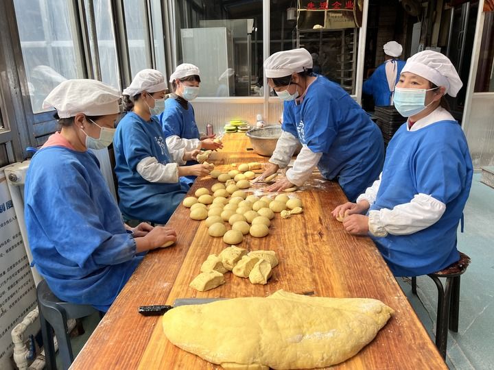 ▲潤(rùn)明餅業(yè)的工人們正在制作傳統(tǒng)糕點(diǎn)制品。