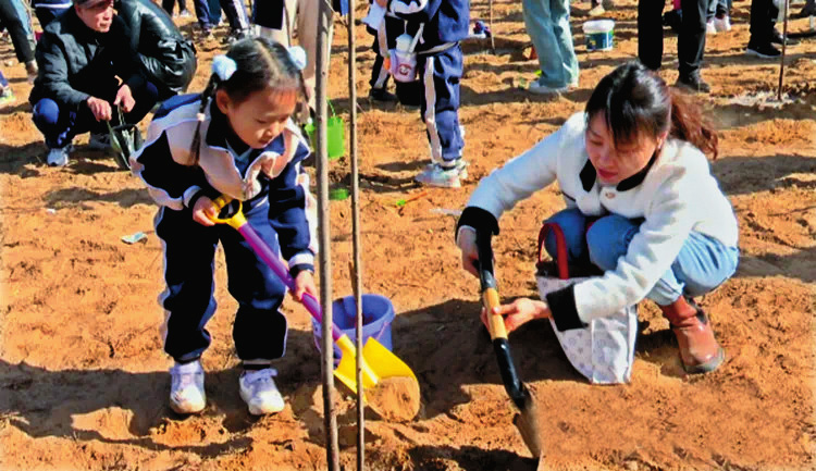 植樹現(xiàn)場,大家分工協(xié)作、默契配合,揮鍬鏟土、扶苗填坑、提桶澆水,每道工序都進行得井然有序,呈現(xiàn)出一派熱火朝天的繁忙景象。大家干勁十足,種下一棵棵希望的樹苗,新栽植的小樹迎風而立,將原本的荒地點綴得生機盎然。