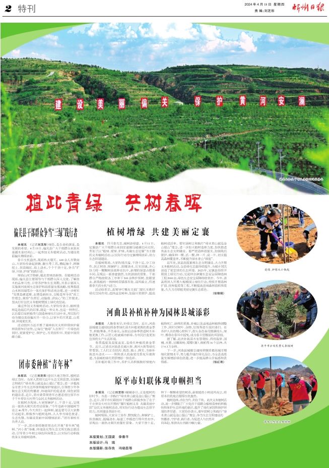 本報訊 (記者劉芝彤)春回大地萬物蘇,植樹添綠正當時。為深入貫徹習近平生態(tài)文明思想,牢固樹立和踐行“綠水青山就是金山銀山”理念,進一步提高全市青少年生態(tài)環(huán)保和植綠護綠意識,引領(lǐng)青少年爭做生態(tài)文明的傳播者、環(huán)境保護的促進者、綠色家園的建設(shè)者,近日,團市委帶領(lǐng)青年志愿者前往原平市子干鄉(xiāng)停旨頭村參與全民義務(wù)植樹活動。
