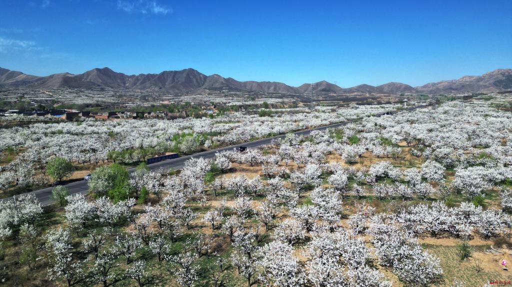 芳菲四月,在原平同川地區(qū)的黃色梯田上,晴雪綻放,香風(fēng)不斷,整個原野一片香雪海。清代詩人王佩鈺曾留下“十里香風(fēng)吹不斷,萬株晴雪綻梨花”的佳句,詩和遠方在梨花中完美交融。