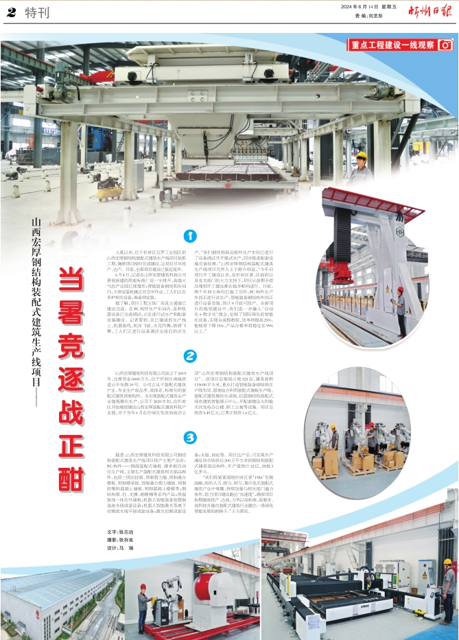 6月4日,記者在山西宏厚建筑科技公司看到新建的兩座標(biāo)準(zhǔn)廠房一字排開,高端大氣的產(chǎn)業(yè)園已現(xiàn)雛形;智能裝備鋼結(jié)構(gòu)車間內(nèi),大型安裝機(jī)械正在空中作業(yè),工人們正在養(yǎng)護(hù)相關(guān)設(shè)備,準(zhǔn)備預(yù)安裝。