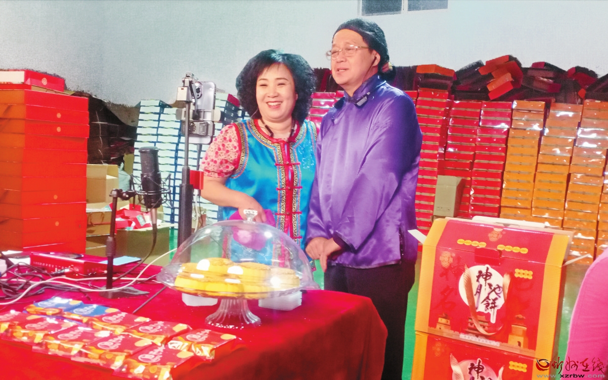 二人臺(tái)演員池銀壽直播銷售神池月餅和麻花。 鄭志東攝