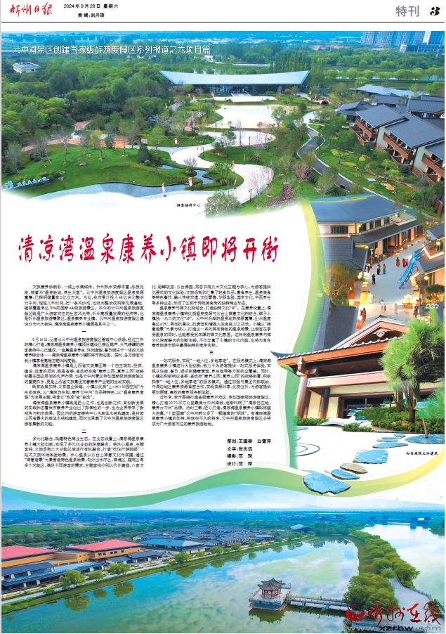 文旅康養(yǎng)添新彩,一城山水滿城詩(shī)。忻州熱水資源豐富、品質(zhì)優(yōu)良,被譽(yù)為“溫泉?jiǎng)俚?、養(yǎng)生天堂”。云中河溫泉旅游度假區(qū)溫泉資源富集,已探明儲(chǔ)量有2億立方米。為此,我市累計(jì)投入48億余元整治云中河,短短幾年時(shí)間,把一條風(fēng)沙溝、垃圾河整治成兩岸花草遍地、植被覆蓋率達(dá)70%的國(guó)家4A級(jí)旅游景區(qū)。如今的云中河溫泉旅游度假區(qū)既是廣大游客向往的生態(tài)風(fēng)光帶、忻州高質(zhì)量發(fā)展的經(jīng)濟(jì)帶,也是忻州溫泉旅游集聚區(qū)、溫泉康養(yǎng)專業(yè)鎮(zhèn)。云中河溫泉旅游度假區(qū)建設(shè)分為六大板塊,清涼灣溫泉康養(yǎng)小鎮(zhèn)便是其中之一。