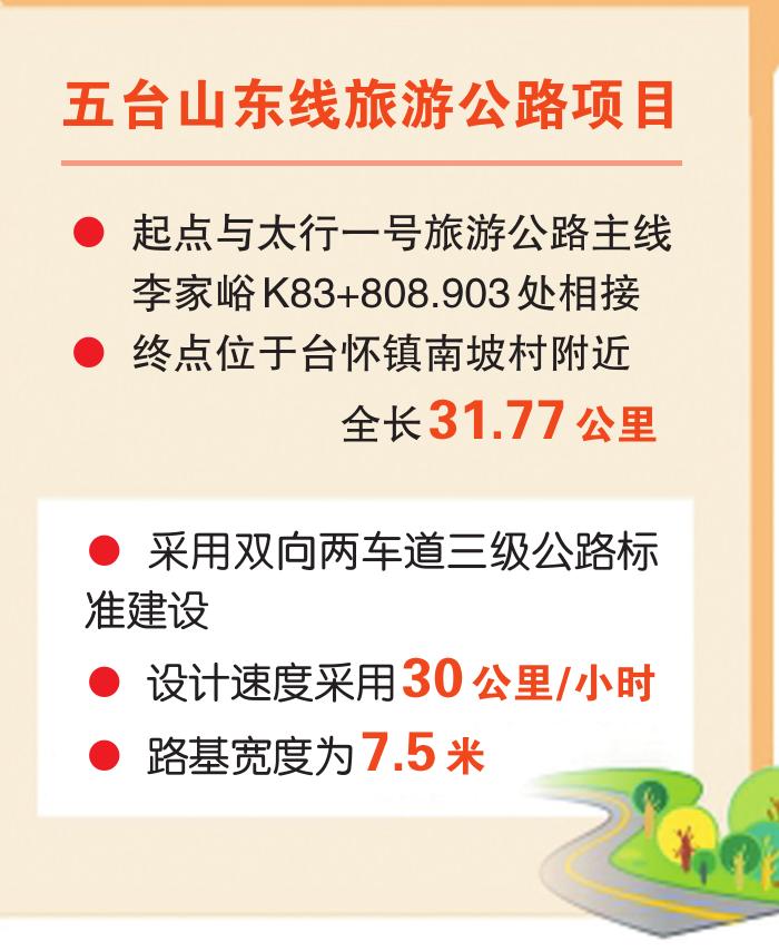 五臺山東線旅游公路起點與太行一號旅游公路主線李家峪K83+808.903處相接,終點位于臺懷鎮(zhèn)南坡村附近,全長31.77公里,采用雙向兩車道三級公路標準建設(shè),設(shè)計速度采用30公里/小時,路基寬度為7.5米。項目實施圍繞“扶貧、旅游、生態(tài)、人文、研學”等核心宗旨,著力提升五臺山風景名勝區(qū)旅游公路的通行能力與服務(wù)水平,強化“交通+旅游”與“經(jīng)濟增長”的導向作用。