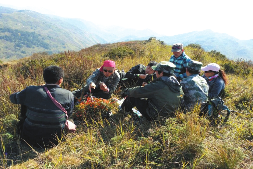 再向前,是一片更茂密的荊棘林,坡度更陡了,大家顧不得叢林中有刺,相互攙扶著向前走。上面是刺人的荊棘,下面是萬丈深淵,腳下的草有點濕滑,一旦踩空,可能粉身碎骨。羊倌一直提醒注意腳下,踩實了再邁步,真是心驚膽戰(zhàn)。幸好前面出現(xiàn)了一處空地,大伙得以小憩,喝點水,補充一下體能。有三人主動放棄登頂,大伙商議后,剩余十人決定繼續(xù)前進,完成登頂夙愿。三人原地守候,等大伙返回后會合。