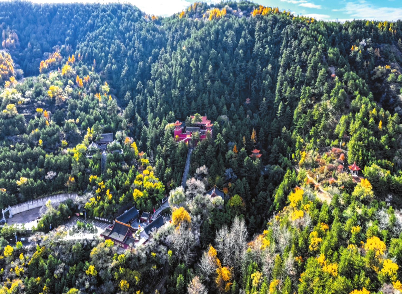 山林間宏大的廟宇建筑群始建于北魏時期,憑借清幽秀麗的自然風(fēng)光和深厚的文化底蘊,吸引了眾多高僧來此傳經(jīng)布道。隨著佛教文化的發(fā)展,與之相關(guān)的建筑藝術(shù)、雕塑藝術(shù)、壁畫藝術(shù)歷代都有發(fā)展,可惜大部分毀于戰(zhàn)火。1992年開始重建,集儒釋道于一體的廟宇群規(guī)模宏大。