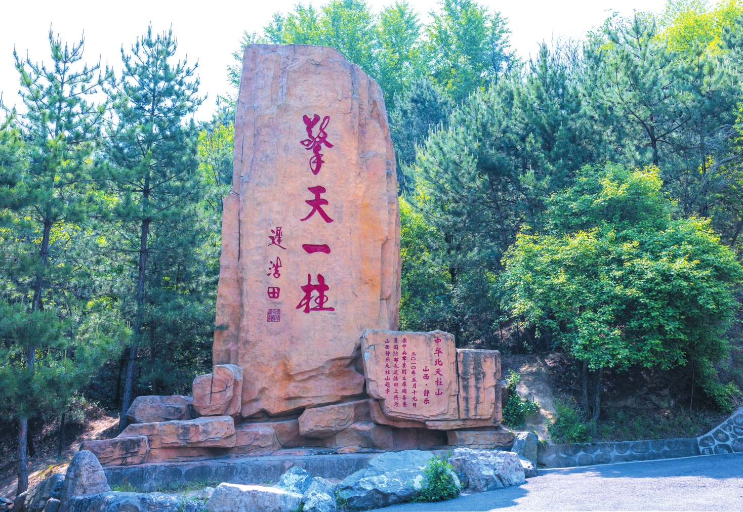 山路向南急轉(zhuǎn)后變得平坦舒緩起來,氣勢恢弘的建筑群呈現(xiàn)在眼前。右邊護(hù)坡上,是天柱山的“名人墻”,鑲嵌著靜樂九大名人的肖像,有功蓋千古的賢相,有戰(zhàn)功赫赫的名將,有學(xué)識淵博的鴻儒,有英勇無畏的革命者。不遠(yuǎn)處,一塊赭色大石莊嚴(yán)矗立,上面是中央軍委原副主席遲浩田上將于2010年5月為天柱山的題詞:擎天一柱。將軍蒼勁有力的書法,與山之威武相得益彰。
