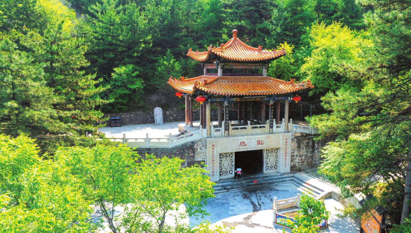 山有水而媚,土得水而沃。從大雄寶殿出來,沿著西門旁一條小道不遠(yuǎn)處,就是那片號稱“天柱松濤”的松林了。只見樹干筆直,枝條蒼勁,直指云霄,林間松脂飄香,氣息悠然。人還在松林中流連尋芳,遠(yuǎn)遠(yuǎn)就能聽到聞名已久的“天柱龍泉”在流淌。龍泉位于景區(qū)廟群西南的龍泉閣,作為“靜樂舊八景”之首的“天柱龍泉”,又名“犬舐泉”,《魏書》載:“爾朱榮高祖羽健居北秀容川。會有狗舐地,因而穿之,得甘泉,故名。”相傳泉中出神龍,故名龍泉。高山出泉是為奇觀,泉水清澈見底,旱不涸、澇不盈,夏飲清神,冬飲沁心。有“天柱圣境啟心智,龍泉奇觀令神怡”之頌。此泉水富含多種礦物質(zhì)和微量元素,是地地道道的“天然級礦泉水”。近幾年上山鍛煉的居民很多,人們上山時自帶裝水工具,攜泉水以做飯和飲用,期盼著龍泉水能給人帶來健康和好運。站在龍泉邊,總能感受到一陣陣濕潤的水氣撲面而來,甚至像風(fēng)一樣輕繞著周身,使人置身于自然美景中不愿離開,連呼吸也變得無比暢快起來。