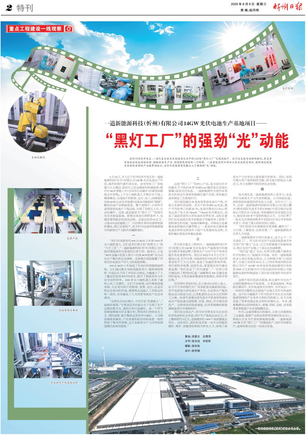 6月24日,步入位于忻州經(jīng)濟(jì)開發(fā)區(qū)的一道新能源科技(忻州)有限公司14GW光伏電池生產(chǎn)車間,強(qiáng)烈的現(xiàn)代感撲面而來(lái)。沒(méi)有傳統(tǒng)工廠的喧囂與人頭攢動(dòng),取而代之的是精密的機(jī)械韻律:數(shù)百臺(tái)AGV智能小車(自動(dòng)導(dǎo)引運(yùn)輸車)沿著預(yù)設(shè)路線無(wú)聲穿梭;上千臺(tái)六軸機(jī)器人手臂在生產(chǎn)線上精準(zhǔn)舞動(dòng),完成硅片的抓取、定位、加工;高精度的在線AOI(自動(dòng)光學(xué)檢測(cè))設(shè)備如同敏銳的“眼睛”,瞬間完成產(chǎn)品瑕疵篩查。整個(gè)流程中,從原料開盒到高效電池片下線包裝,實(shí)現(xiàn)了全程無(wú)人化、自動(dòng)化操作。這里,就是被譽(yù)為“黑燈工廠”的現(xiàn)代化光伏制造基地。即使在夜間無(wú)照明條件下,也能依靠智能系統(tǒng)高效運(yùn)轉(zhuǎn)。這座總投資60億元、占地474畝的超級(jí)工廠,歷經(jīng)兩年多時(shí)間緊鑼密鼓的建設(shè),現(xiàn)已全面投產(chǎn),成為忻州這座傳統(tǒng)能源城市向新質(zhì)生產(chǎn)力躍升的耀眼地標(biāo)。