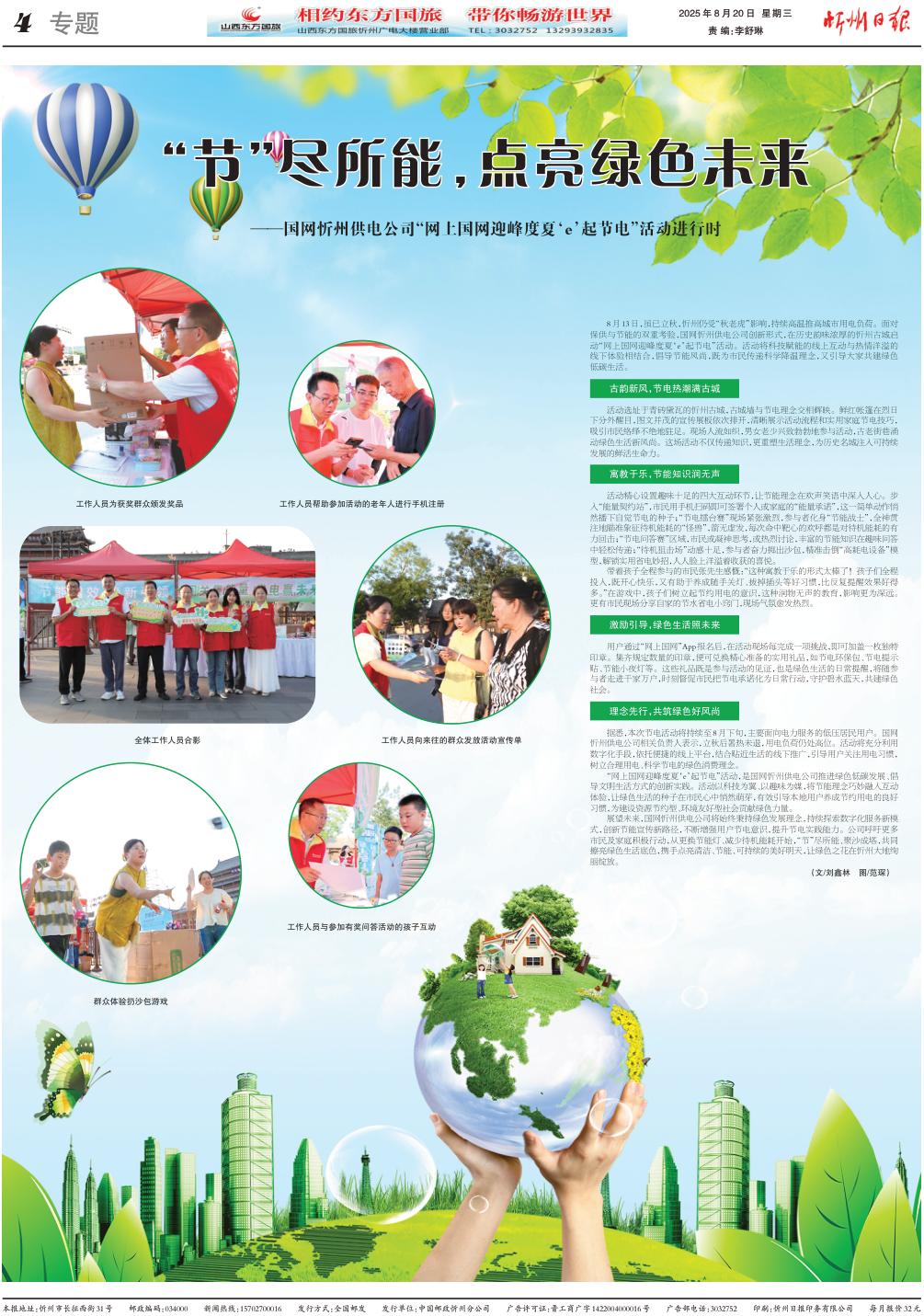 8月13日,雖已立秋,忻州仍受“秋老虎”影響,持續(xù)高溫推高城市用電負(fù)荷。面對(duì)保供與節(jié)能的雙重考驗(yàn),國網(wǎng)忻州供電公司創(chuàng)新形式,在歷史韻味濃厚的忻州古城啟動(dòng)“網(wǎng)上國網(wǎng)迎峰度夏‘e’起節(jié)電”活動(dòng)?;顒?dòng)將科技賦能的線上互動(dòng)與熱情洋溢的線下體驗(yàn)相結(jié)合,倡導(dǎo)節(jié)能風(fēng)尚,既為市民傳遞科學(xué)降溫理念,又引導(dǎo)大家共建綠色低碳生活。