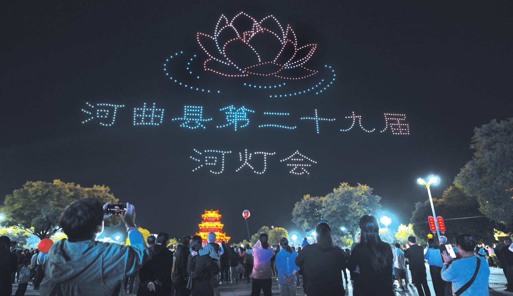 為期三天的無人機表演,創(chuàng)新采用3D動態(tài)編隊技術(shù),通過40組高精度畫面切換,將河曲的地理標(biāo)志、文化符號與時代精神深度融合,實現(xiàn)“一幕一主題、幀幀皆故事”的沉浸式體驗,以“科技+文旅”讓市民和游客領(lǐng)略大美河曲的獨特魅力。市民張一婷說:“能在家門口看到這么高水平的無人機表演,挺自豪的。這種創(chuàng)新的‘文化表達’方式將我們家鄉(xiāng)的故事用高科技手段‘寫’在了夜空這張畫卷上。這說明家鄉(xiāng)的發(fā)展不只在經(jīng)濟方面,更是一種文化上的自信與創(chuàng)新。河燈與無人機燈光天地呼應(yīng),是傳統(tǒng)與現(xiàn)代的完美融合?!?/p>