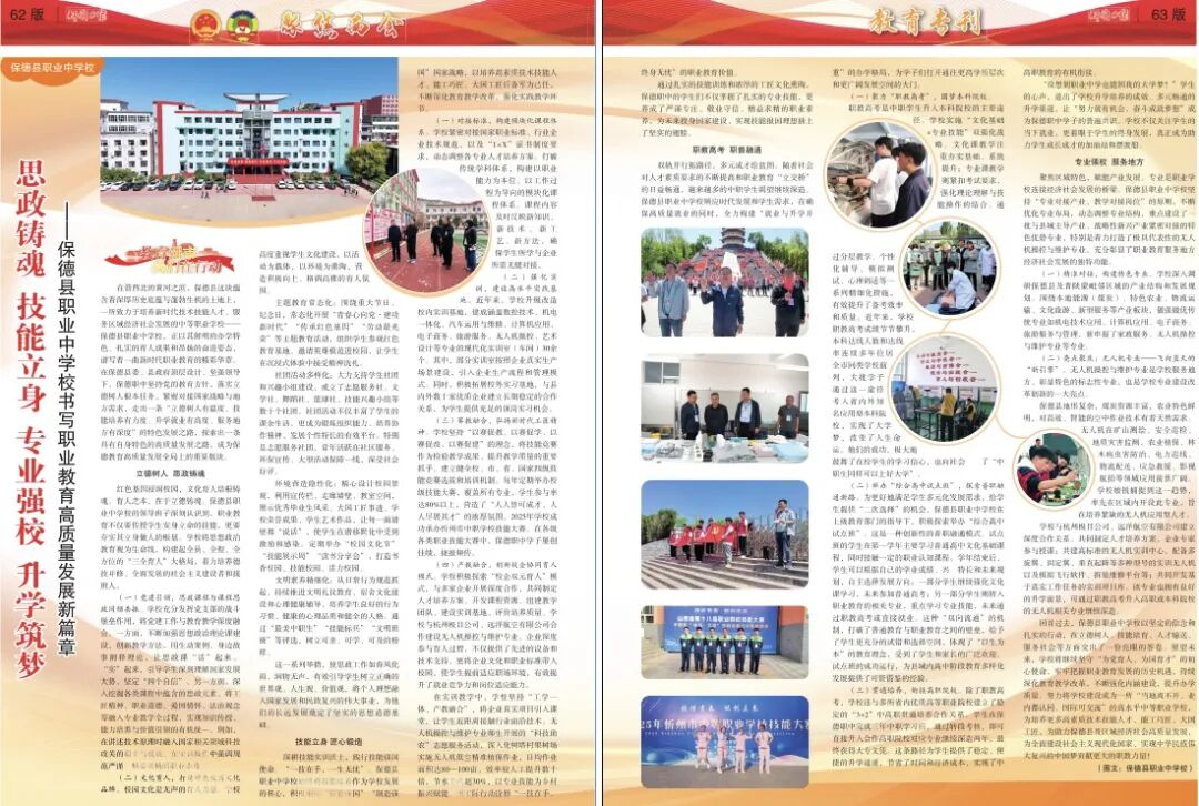 回首過去,保德縣職業(yè)中學校以堅定的信念和扎實的行動,在立德樹人、技能培育、人才輸送、服務社會等方面交出了一份亮眼的答卷。展望未來,學校將繼續(xù)堅守“為黨育人、為國育才”的初心使命,牢牢把握職業(yè)教育發(fā)展的歷史機遇,持續(xù)深化教育教學改革,不斷強化內涵建設,提升辦學質量。努力將學校建設成為一所“當地離不開、業(yè)內都認同、國際可交流”的高水平中等職業(yè)學校,為培養(yǎng)更多高素質技術技能人才、能工巧匠、大國工匠,為助力保德縣及區(qū)域經濟社會高質量發(fā)展,為全面建設社會主義現代化國家、實現中華民族偉大復興的中國夢貢獻更大的職教力量!