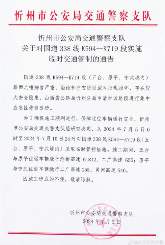 關(guān)于對國道338線K594—K719段實施臨時交通管制的通告