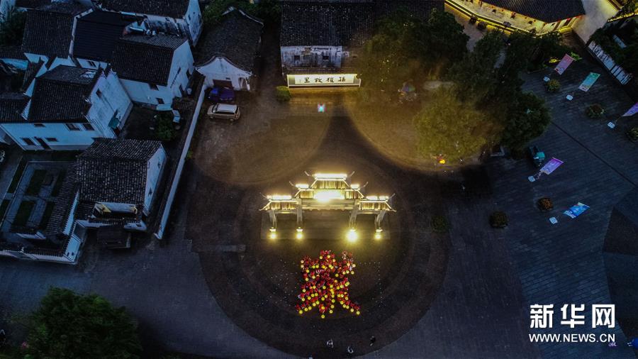 9月29日,龍門鎮(zhèn)文明志愿幫幫團的志愿者提著花燈排成一個“家”字,慶祝古鎮(zhèn)廟會開啟(無人機照片)。新華社記者 徐昱 攝