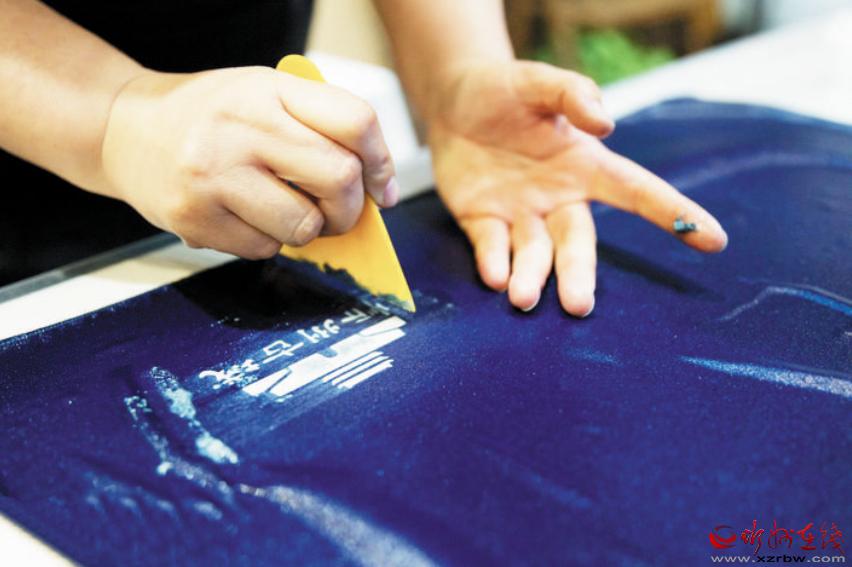 灰纈的最后一步是刮漿。由于灰漿的保護(hù),設(shè)計(jì)好的圖案得以在染好的布料上被保留下來(lái),形成好看的圖樣及花式。