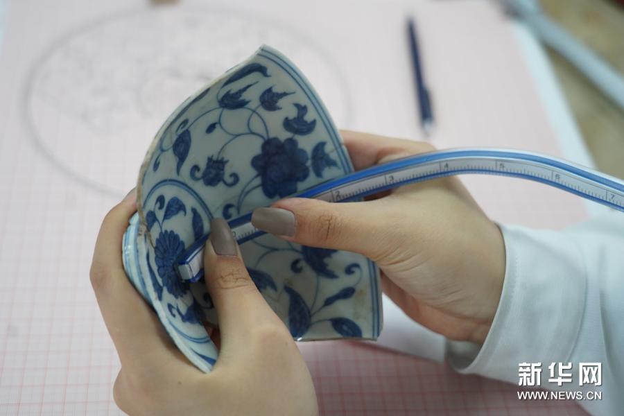 修復(fù)師何奕慧在測(cè)量一件瓷器,將三維瓷器上的圖案還原到二維的紙面上,必須要經(jīng)過(guò)仔細(xì)的測(cè)量(12月3日攝)。新華社記者 周密 攝
