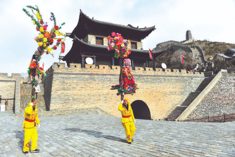 2月23日,在山西省代縣雁門關,郝永?。ㄗ螅┰谶M行撓閣表演。