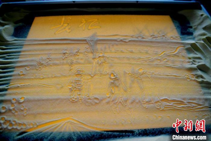 滕琦昕正在創(chuàng)作沙畫作品 張瑤 攝 “創(chuàng)作過程中,需要注意很多細(xì)節(jié)。由于沙子細(xì)軟,微風(fēng)便可將其吹散,要在一個(gè)封閉、黑暗的環(huán)境下才能更好地作畫?!彪空f。 巧渡金沙江、強(qiáng)渡大渡河、翻雪山、過草地……滕琦昕告訴記者,團(tuán)隊(duì)成員最終確定了長(zhǎng)征過程中的12個(gè)重要節(jié)點(diǎn)。隨后,通過搜索資料、看照片和繪畫作品尋找靈感。