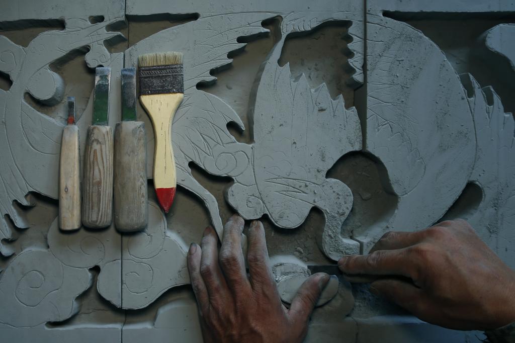 雕前先“打樣”:把設(shè)計(jì)稿拓印在涂抹過(guò)石灰水的磚面上,或者在磚塊上直接描畫(huà)?,F(xiàn)在許多外地磚雕加工廠多用電腦打樣,生產(chǎn)出來(lái)的是“制式”產(chǎn)品,千篇一律。磚雕常用的圖案王鎖貴早已爛熟于心,想要的圖案在青磚上一揮而就,當(dāng)真是“鐵劃銀鉤”、揮灑自如。如此,則構(gòu)圖更加生動(dòng),細(xì)節(jié)更加充盈,最主要的是絕不雷同。接下來(lái)“打坯”:用鑿子或刻刀粗略勾勒畫(huà)面輪廓,分出基本層次。最后是“出細(xì)”:運(yùn)用多種工具,或鏟、或刻、或挑,以刻畫(huà)細(xì)節(jié)。