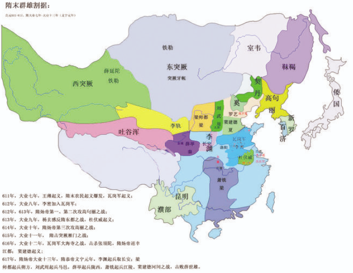 北部的武裝起義力量以劉武周和李淵父子為代表,他們主要活動在雁門關南北以及并州、晉陽一帶。隋義寧元年(617年),劉武周建立政權,自封為王。這一年中,同時存在的反隋政權有昌達、太平、丁丑、永平、天興、永隆、正平、秦興、鳴鳳、通圣、義和、建稽等。劉武周的反隋根據地在雁門關北馬邑郡,與突厥接壤,他自封為樂王后,率軍揮師西進,很快拿下了隋煬帝行宮汾陽宮的所在地——樓煩郡。