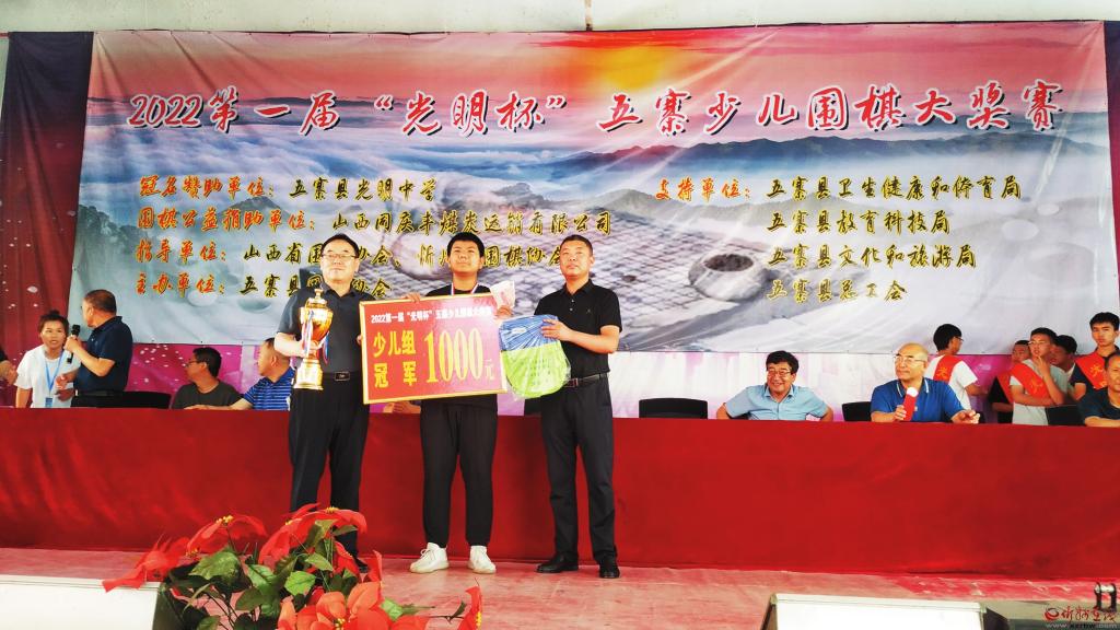 這次大獎(jiǎng)賽由五寨縣圍棋協(xié)會(huì)主辦,五寨縣光明中學(xué)冠名贊助,山西同慶豐煤炭運(yùn)銷有限公司贊助支持。開幕式上,山西省圍棋協(xié)會(huì)向五寨縣圍棋協(xié)會(huì)捐贈(zèng)了價(jià)值8500元的智能一體機(jī)一臺,忻州市圍棋協(xié)會(huì)向五寨縣圍棋協(xié)會(huì)頒發(fā)了“立足五寨沃土,培養(yǎng)圍棋人才”的獎(jiǎng)牌,并捐贈(zèng)了價(jià)值7200元的高檔圍棋凳40個(gè)。山西省圍棋協(xié)會(huì)向五寨縣光明中學(xué)捐贈(zèng)國學(xué)經(jīng)典書籍一套,山西人民出版社社長姚軍(圍棋5段)向大賽組委會(huì)贈(zèng)送書法作品一幅。