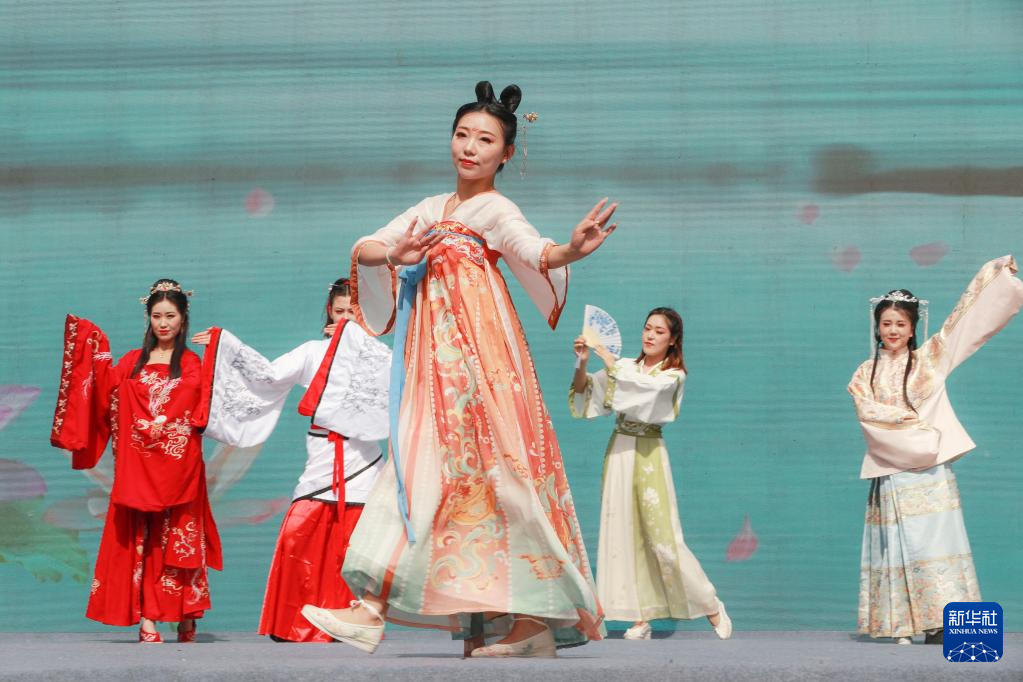 當(dāng)日,河南省葉縣首屆漢服文化節(jié)在縣城葉園開幕。漢服巡游、漢風(fēng)國韻演出等豐富多彩的活動,吸引了眾多游客和市民前來觀看,感受漢服文化的魅力。新華社發(fā)(何五昌攝)