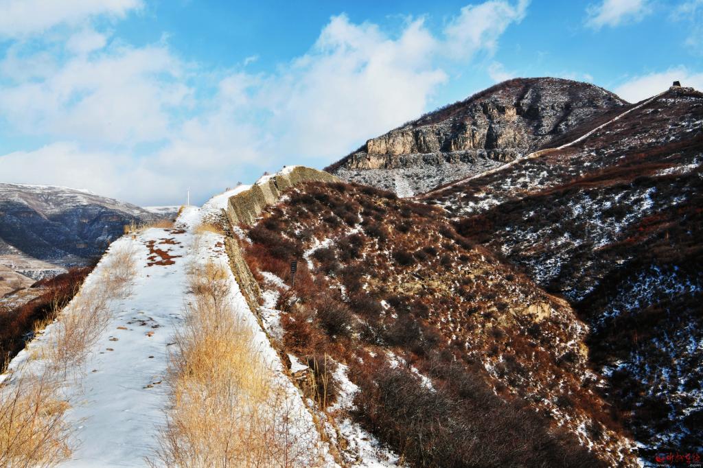 宋長城與北齊、隋修筑的早期長城匯合后,長城墻體疊壓在這段早期長城上面,經(jīng)過加高加寬繼續(xù)向東行進,一直走到荷葉坪山腳下結(jié)束。其中王家岔、寧家岔一帶保存得最為完好,達到了極致。