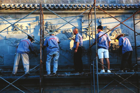溫建明帶領(lǐng)團(tuán)隊(duì)為榆次什貼古鎮(zhèn)創(chuàng)作160米的《晉商萬(wàn)里茶道》大型磚雕文化墻。