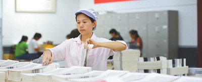 安徽省涇縣三希堂線裝文化園,工人正在原大影印摛藻堂本《欽定四庫(kù)全書薈要》生產(chǎn)線上忙碌。