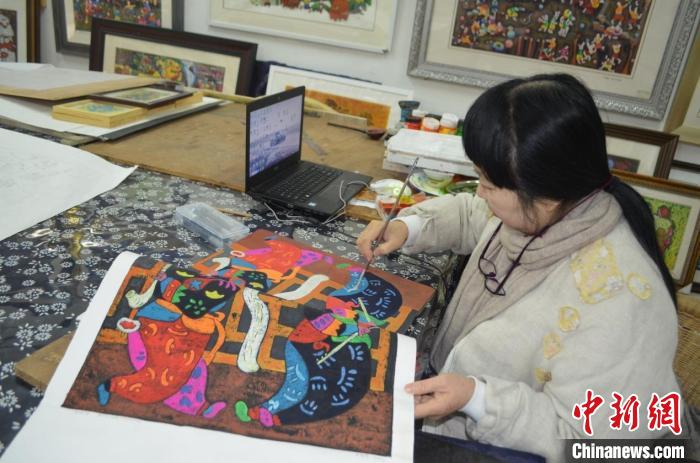 “小時候跟著奶奶學習納鞋底、刺繡,漸漸地喜歡上了繪制各種圖案,我的刺繡在村里也小有名氣。17歲那年,四川美術學院的老師到村里招收版畫學徒,我就報名了。當時條件很艱苦,很多人不理解,被家里人說不務正業(yè)。但我就是喜歡這些色彩、線條,一直堅持到現(xiàn)在?!苯徽勚校畛芍フ勂鹚陌娈嬌?。