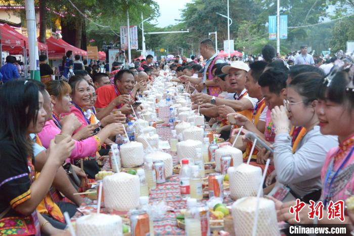 4月11日,2024年海南黎族苗族傳統(tǒng)節(jié)日“三月三”節(jié)慶活動(dòng)主會(huì)場(chǎng)活動(dòng)長(zhǎng)桌宴在保亭黎族苗族自治縣舉行。張?jiān)潞?攝