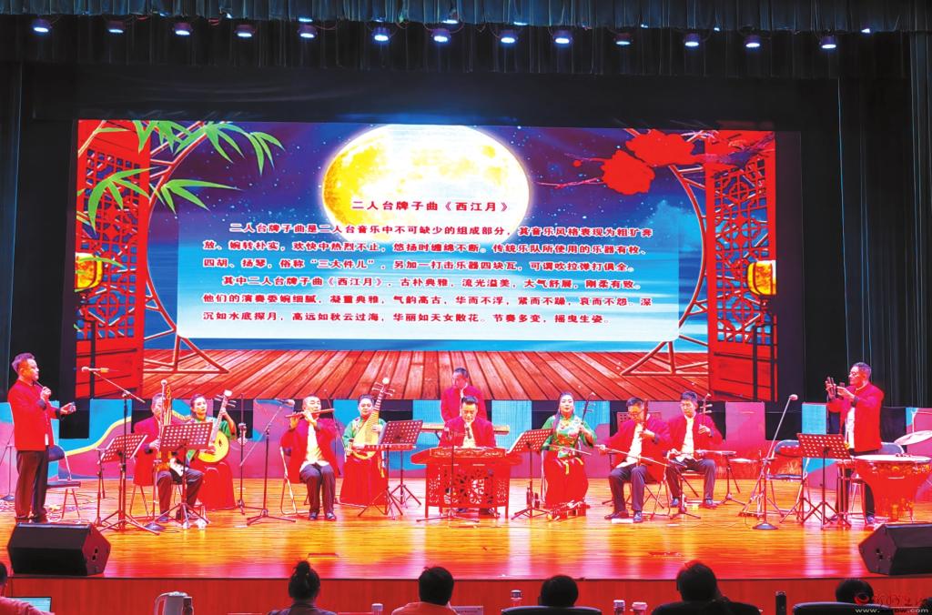 由神池縣文化和旅游局選送、神池縣啟航道情劇團(tuán)演奏的神池道情曲牌聯(lián)奏《情系道情》,是一首民樂新作。全曲以傳統(tǒng)曲牌〔碰梆子〕為基調(diào),串聯(lián)了〔大救駕〕〔虞美人〕〔夾墻瞭〕〔吊棒槌〕〔上南坡〕〔富貴不斷頭〕〔出隊子〕等曲牌,運(yùn)用主題變奏、調(diào)性擴(kuò)展等手法,構(gòu)成一組具有“散—慢—中—快”序列性結(jié)構(gòu)變化的單樂章,具有鮮明的描寫性、敘事性和抒情性。全曲結(jié)構(gòu)緊湊,織體豐富,濃淡有致,演奏張弛有度,色彩鮮明,風(fēng)味獨(dú)特,博得評委觀眾一致好評。