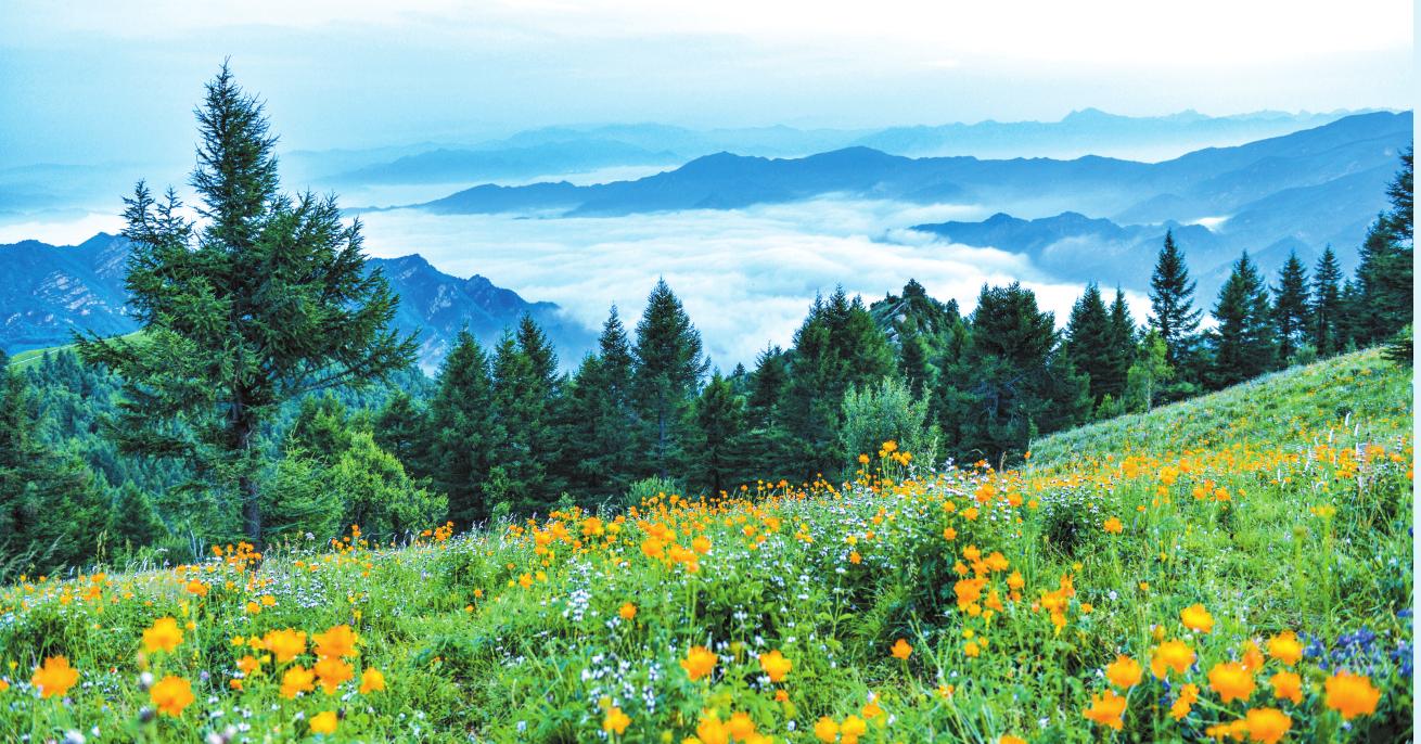 駝梁地形四周封閉,中為谷地,形成了山巒綿亙、溝壑縱橫、河川橫跨東西的自然生態(tài)景觀。其主峰海拔2281米,為“晉冀兩省四縣”交匯處,駝峰山巒蜿蜒,此起彼伏,猶如“靜臥巨駝”而取名駝梁。與五臺山風(fēng)景名勝區(qū)東北相望,遙相呼應(yīng),有其獨特和不可替代之優(yōu)勢,同為五臺山旅游資源亮點。由山谷到山頂分布著落葉林混交林帶、樺樹林帶、落葉松林帶,生物垂直分布變化明顯。駝梁頂部,有一片亞高山草甸,約近萬畝的茵茵綠草,像碩大無比的地毯,與天際交接,一望無垠。隱于藍天白云和松林綠波之間,散落著漫山遍野的杜鵑花、金蓮花、百合花、燈籠花等,置身其間,如進花海,恍若仙境。因位于云霧縹緲的高山之巔,故被人譽為“云頂花海”。