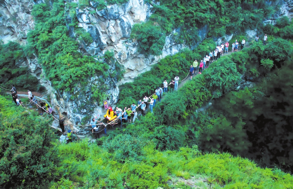 上山的路越來(lái)越難走,也越來(lái)越危險(xiǎn)。前方是峭壁,只容一人通過(guò),腳下便是萬(wàn)丈深淵,一旦失足,后果難料。女士們有點(diǎn)害怕。朱部長(zhǎng)一邊鼓勵(lì),一邊教她們要領(lǐng):踩實(shí)、抓穩(wěn)、不要向下看。前面幾位戰(zhàn)戰(zhàn)兢兢相繼通過(guò),最后一位女士微胖,滿臉汗珠,雙腿打顫,人們都為她捏了一把汗,好在有驚無(wú)險(xiǎn)。