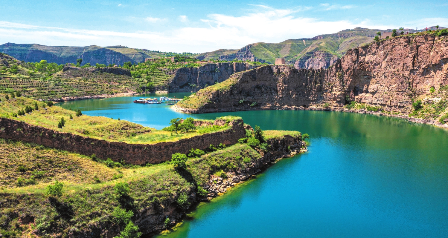 從壺口到禹門口,沿途有不少觀景臺(tái),下臨深谷,白浪翻卷,水聲響亮。黃河泛黃時(shí)候,觀景臺(tái)上只聞水聲轟鳴,看不出浪花。此時(shí)黃河清,白浪顯,成了新景。抵達(dá)禹門口,黃河也是綠的,游艇在河里開過(guò),水面上劃出道道波紋,宛如鋪展著的巨幅油畫。