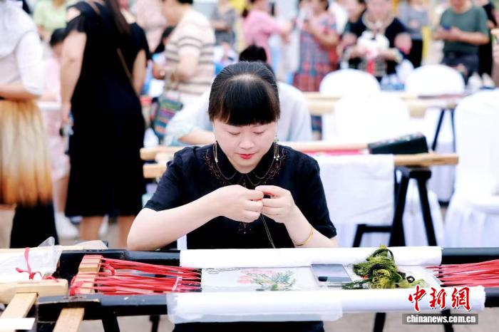 5月29日,第三屆“金針杯”中國(guó)刺繡技藝交流活動(dòng)在四川成都郫都區(qū)舉行,現(xiàn)場(chǎng)蜀繡從業(yè)者展示刺繡技藝。(郫都區(qū)融媒體中心供圖)