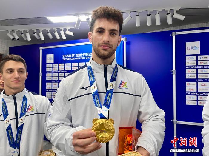 8月10日晚,成都世運(yùn)會(huì)期間,以色列蹦床運(yùn)動(dòng)員羅特姆·阿米海(Rotem Amihai)展示獎(jiǎng)牌,該獎(jiǎng)牌綬帶采用蜀繡工藝。王利文 攝