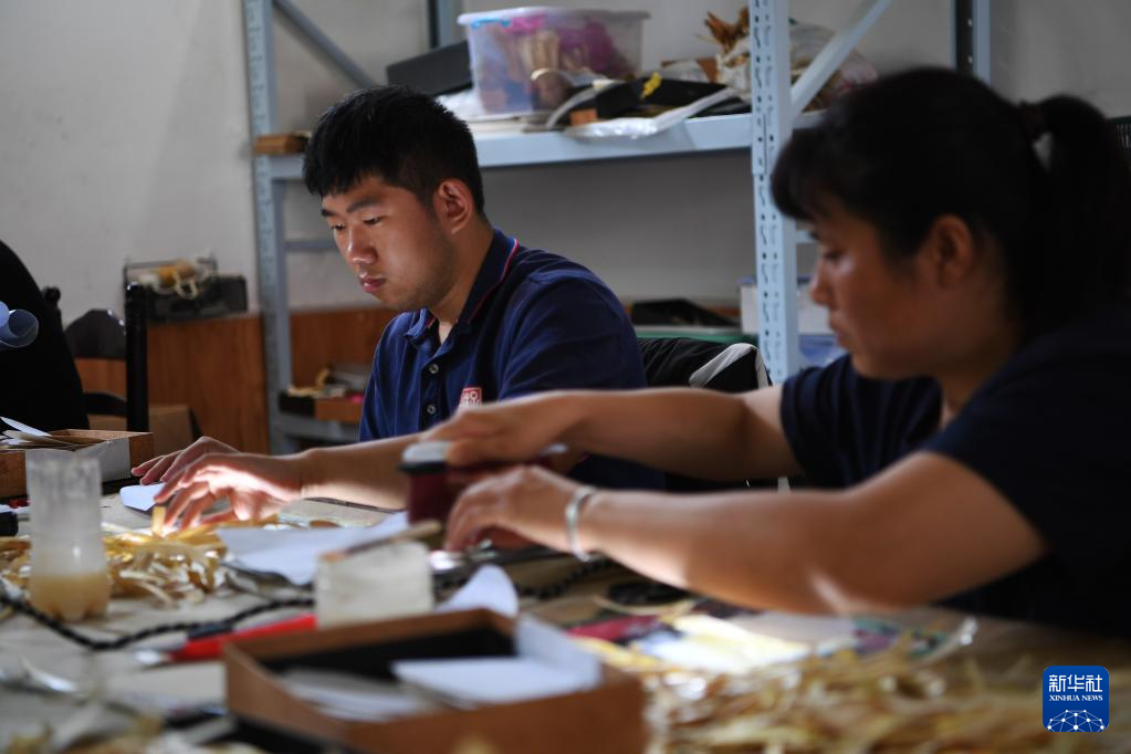 5月17日,張富揚(yáng)(左)在非遺傳習(xí)基地制作蘆葦畫。