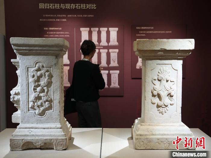 10月13日,“圓明園石柱回歸展暨2023北京公眾考古季”開幕式在北京圓明園博物館舉行。展覽集中展示7件圓明園流失石柱文物,均為漢白玉材質,推測均來自西洋樓遺址區(qū)。 記者 崔楠 攝