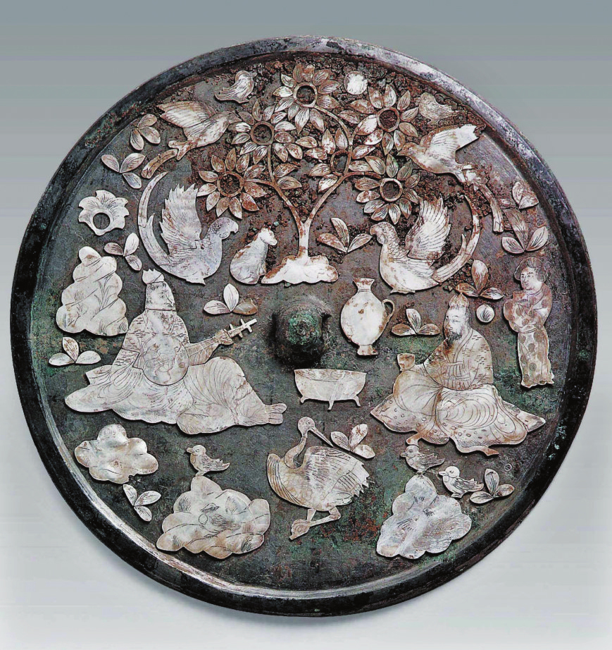 人物花鳥紋嵌螺鈿漆背銅鏡