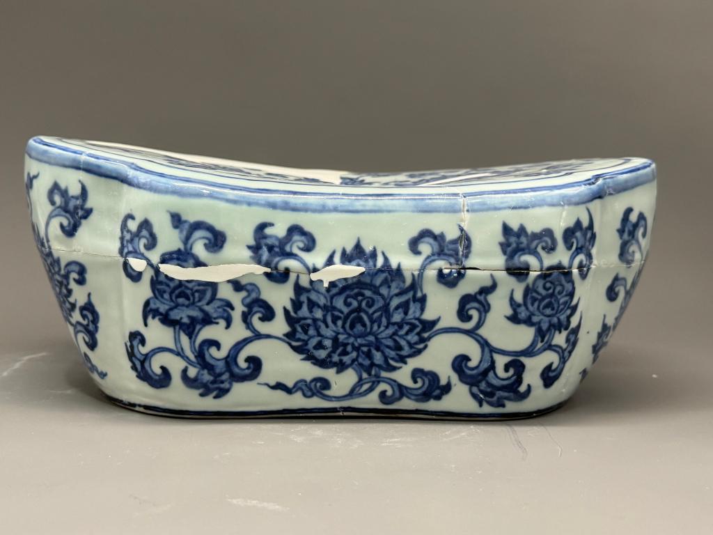 修復(fù)后的瓷枕器形一致,大小在長(zhǎng)31.5厘米、寬23厘米、高12.3厘米左右。枕呈如意頭形,中空、枕面微凹、平底。枕面邊沿隨枕形勾勒雙線邊飾,其內(nèi)繪青花花卉紋飾,側(cè)壁亦繪青花花卉紋飾。外底中間銅錢紋,以作排氣用。